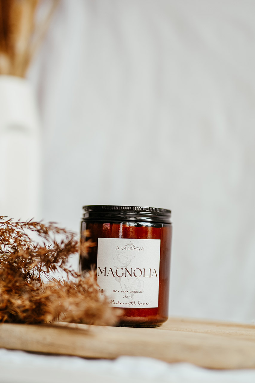 Rozkoszuj się pięknym zapachem magnolii dzięki naszej naturalnej świecy sojowej o pojemności 250 ml.